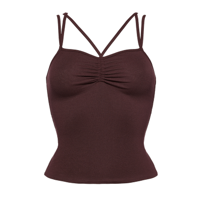 - Tanktop- V-Ausschnitt- Rippeneffekt- Doppelte Träger, die an den Schultern gerade und am Rücken V-förmig verlaufen- Kräuselbänder am Ausschnitt- Im Rücken gekreuzte Spaghettiträger- Gerader Rücken- Hinten eingesticktes ERES-Logo- In Italien hergestellt