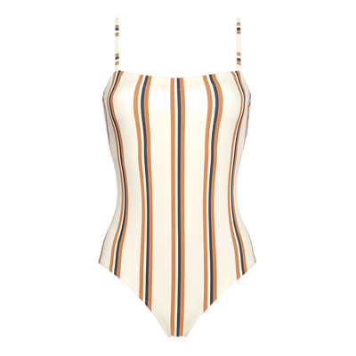 Der ikonische Badeanzug Aquarelle erscheint in dieser Saison mit einem ganz neuen Streifenmuster. Der im Kette-und-Schuss-Gewebe gestaltete Badeanzug Iode schmeichelt mit seinen schlichten Linien jeder Silhouette.