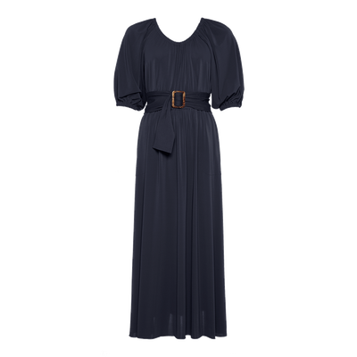 - Langes Kleid- Jersey- Gummizüge am Ausschnitt, an der Taille und den Ärmelbündchen- Wahlweise schulterfrei zu tragen- 3/4-Ärmel- Abnehmbarer Gürtel aus Peau Douce mit Schnalle aus Acetat, ohne Gürtelschlaufen- In Frankreich hergestellt