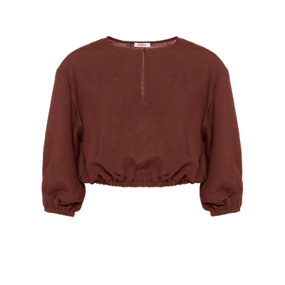 - Top- Leinen- Runder Ausschnitt mit einem mittigen Schlitz vorne, der sich mit einem Knopf schließen lässt- Weite, ellenbogenlange Ärmel mit Gummizug- Gummizug an der Taille- In Bulgarien hergestellt
