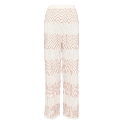 Mit diesem Zickzack-Lochstrickmuster, bei dem sich gebrochenes Weiß und der sanfte Braunton Marron glacé abwechseln, erschafft ERES Matrosenstreifen einer neuen Art.