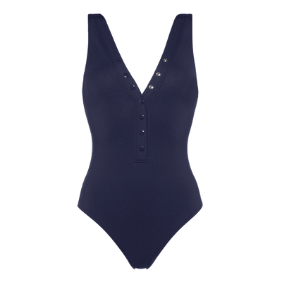 - Swimsuit- Wide straps- Neckline band adorned with functional press studs at the front- Round low-cut back - Made in France