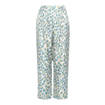 El pantalón Jaragua está confeccionado en una sarga de seda con un estampado que evoca un las manchas de las conchas. Aunando elegancia y suavidad, cuenta con acabados ribeteados en contraste y unos pliegues planos en la parte delantera.