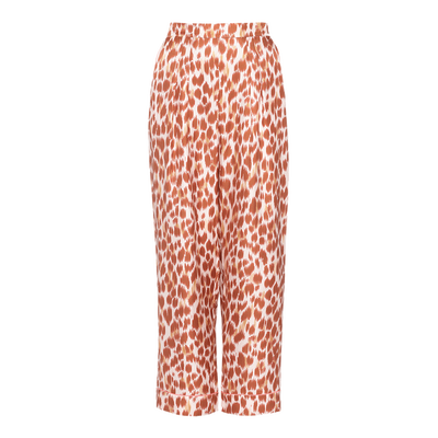 El pantalón Jaragua está confeccionado en una sarga de seda con un estampado que evoca un las manchas de las conchas. Aunando elegancia y suavidad, cuenta con acabados ribeteados en contraste y unos pliegues planos en la parte delantera.