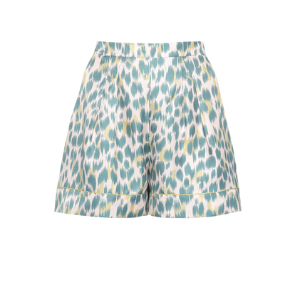 Decorados con motivos moteados que recuerdan al aspecto de ciertas conchas, Palmeraie son unos shorts elegantes de sarga de seda. Destacan por su elegancia gracias a sus acabados ribeteados en contraste, su dobladillo en la parte inferior y su elástico en la parte trasera.