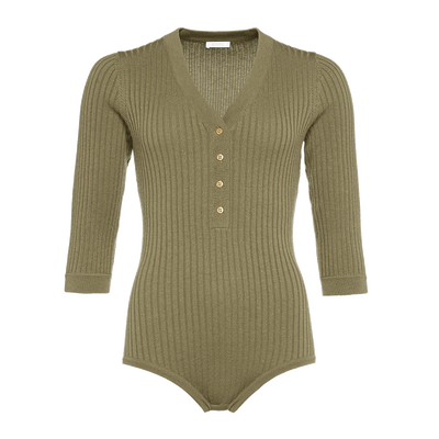 - Body- Lana y cachemira- Escote en V- Acabados acanalados: escote, tapeta debotones, sisas y contorno de las piernas- Detalles calados en las sisas- Botones en el centro del delantero- Mangas tres cuartos- Botones a presión en la entrepierna- Hecho en China