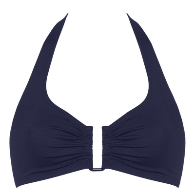 - Triángulo envolvente- Peau Douce natural- Fruncido en el centro del pecho- Copas separadas por una hebilla en U- Tirantes tipo foulard anudados al cuello- Varillas laterales- Hecho en Italia