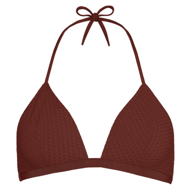 - Sujetador triangular con pinzas en el pecho- Jacquard- Pinzas en el pecho- Tirantes espagueti rectos o anudados al cuello- Banda bajo el pecho de grogrén- Forro en los colores Kumquat y Sable fin- Hecho en Francia