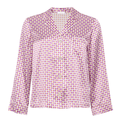 Un imprimé hypnotique en trois couleurs (Lilas, blanc et Ambré), qui évoque les seventies au premier coup d’œil.