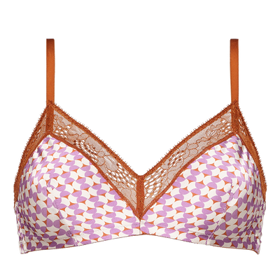 Le triangle sans armatures Indie offre douceur par ses teintes de lilas, blanc et ambre et sa matière en satin de soie stretch.