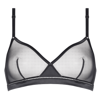 Dans un jeu de contraste, ce triangle sans armatures reprend les différents codes de la Maison ERES : tulle, satin et détails ajourés. Forme iconique, il assure un maintien et un confort optimal grâce à sa bande thorax élastique recouverte de satin.