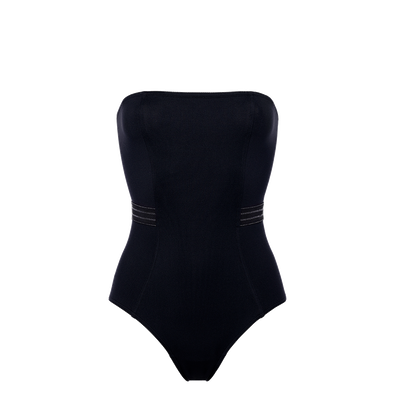 Des maillots pour le soir, dont les coupes architecturales sont soulignées par un élastique façon gros grain à rayures Lurex - un rappel des scintillements du soleil. Grâce au savoir-faire unique d’ERES, ce ruban souple suit les courbes du corps, accentue les lignes et rend chaque modèle encore plus spectaculaire.