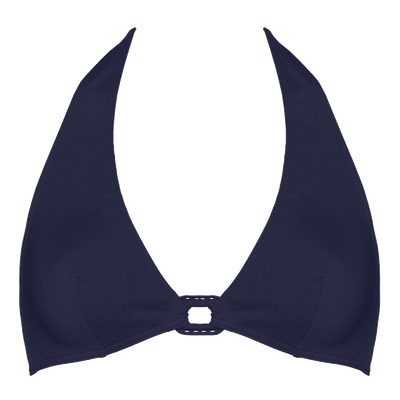 - Triangle emboîtant- Bretelles esprit foulard attache cou- Pinces poitrine et baleines côtés- Bonnets séparés par une boucle en polyamide recouverte de Peau Douce- Surpiqûres contrastées en blanc sur la boucle type point sellier- Fabriqué en France