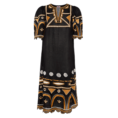 La robe Ornement joue sa singularité en mariant décontraction et élégance. Les motifs brodés ajoutent une touche de sophistication tandis que les manches courtes évasées et festonnées, lui confèrent une allure moderne. La ceinture est amovible, permettant de personnaliser la silhouette.