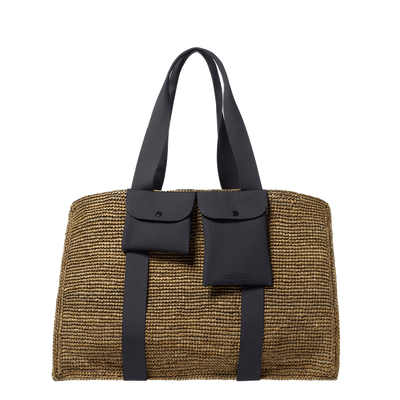 Realizzata in rafia, Voyageur è una borsa a cestino orizzontale arricchita da tasche e manici in Peau Douce, materiale emblematico della Maison ERES.