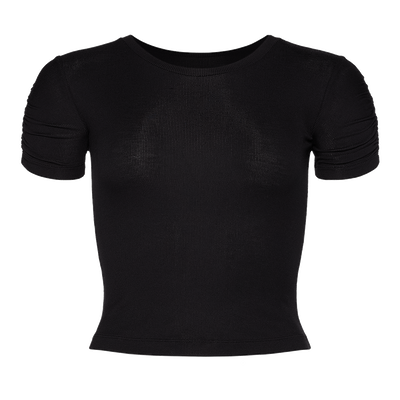 - T-shirt- Micromodal ed elastan- Collo rotondo- Effetto a coste- Maniche corte- Effetto drappeggiato sulle maniche- Logo ERES ricamato sul retro- Prodotta in Italia