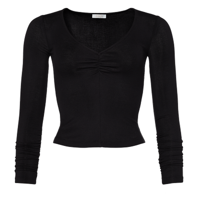 - T-shirt- Micromodal ed elastan- Scollatura a V- Effetto a coste- Maniche lunghe- Effetto drappeggiato sul davanti e sui polsini- Logo ERES ricamato sul retro- Prodotta in Italia