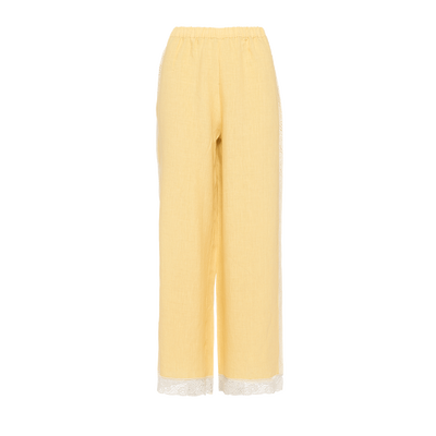 Lagune è un pantalone realizzato in lino, leggero e vaporoso. I bordi in pizzo sui lati e sul fondo del modello lo rendono un capo elegante e versatile da indossare in molte occasioni.