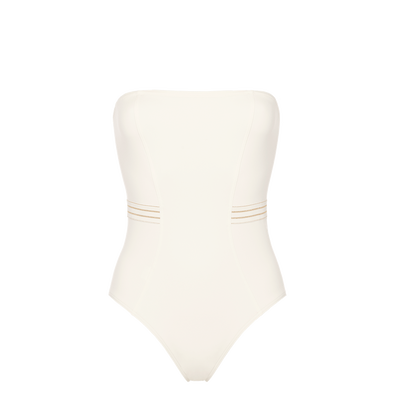 Costumi da bagno per la sera, i cui tagli architettonici sono sottolineati da un elastico tipo gros grain con righe di Lurex, un richiamo ai riflessi del sole. Grazie alla maestria unica di ERES, questo nastro flessibile segue le curve del corpo, accentua le linee e rende ogni modello ancora più spettacolare.