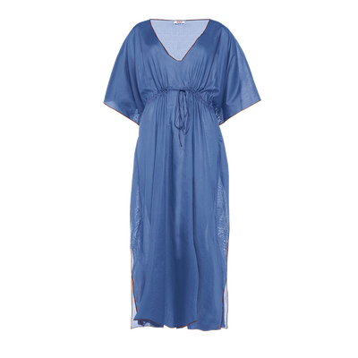 - Caftano- Voile di cotone- Scollatura a V- Maniche corte- Bordo a contrasto- Cordoncino sottoseno- Lunghezza sopra le caviglie- Prodotto in Bulgaria