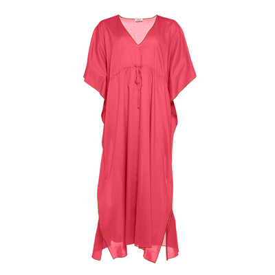- Caftano- Voile di cotone- Scollatura a V- Maniche corte- Bordo a contrasto- Cordoncino sottoseno- Lunghezza sopra le caviglie- Prodotto in Bulgaria