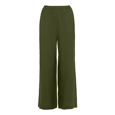 - Pantalone largo- Lino- Elastico in vita- Due tasche applicate sui lati e sul retro- Orli larghi sul fondo del modello- Prodotto in Bulgaria