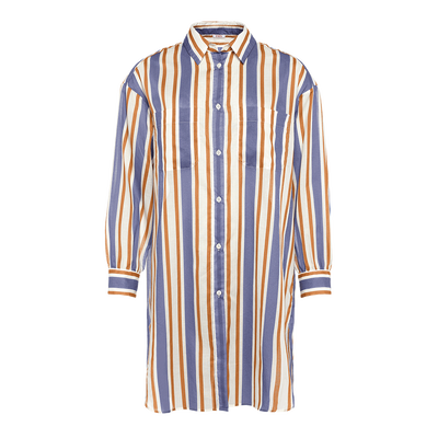 - Camicia- Voile di cotone- Collo camicia- Tasche applicate sul petto da ogni lato- Spacchi aperti laterali o in fondo al modello- Righe piazzate con giunzione- Prodotta in Bulgaria