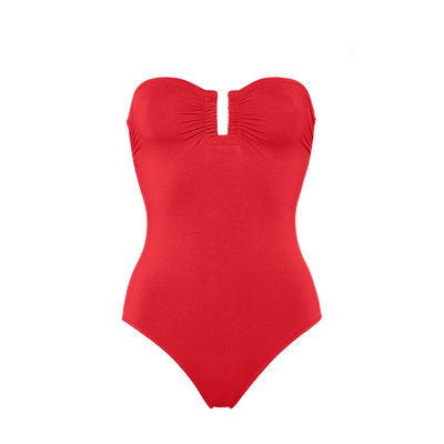 This iconic bustier one-piece, with gripper tape, can be recognised by its gathered cups separated by a U-shaped link. It enhances all body types.- Bustier one-piece- Bust gathered at centre, front and sides - Cups separated by a U-shaped link - Gripper tape- Made in Italy