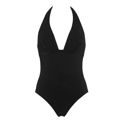 - Sophisticated one-piece- Jacquard- Slender straps to tie around the neck- V-shaped neckline- Grosgrain underbust band- Bust darts- Slightly rounded back- Lined front and back for the Kumquat and Sable Fin colourways- Made in Morocco