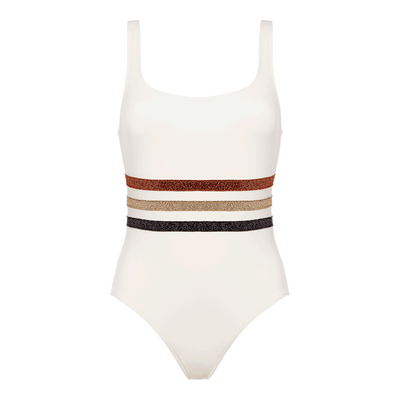 Inspired by our iconic Asia, this one-piece swimsuit features wide straps and a rounded neckline. Its graphic waist panel, in shimmering lurex, sculpts your silhouette and suits all body types.