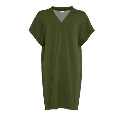 Tali is a short V neck tunic in flowing crêpe jersey.- Short tunic- Jersey- V neckline- Short sleeves- Raw seam: bottom