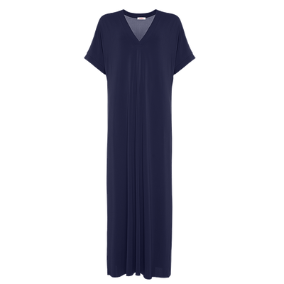 - Long dress- Jersey- V-shaped neckline- Short sleeves- Raw-cut bottom hem - Comes to just above the ankle- Made in France