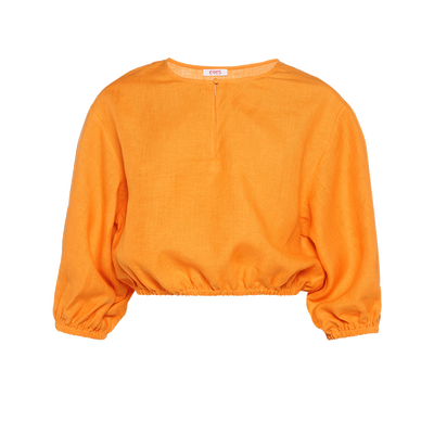 - Top- Linen- Round neck with buttoned V-shaped slit in the centre front- Wide, elasticated, elbow-length sleeves- Elasticated waist- Made in Bulgaria