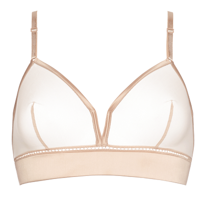Los esenciales y atemporales modelos bicolor de la línea combinan tul y satén en sofisticadas variantes: el marrón Make Up y el falso negro Ultra. Esta temporada, la colección se enriquece con una nueva pieza destacada: un sujetador de diseño contundente, Fidèle.