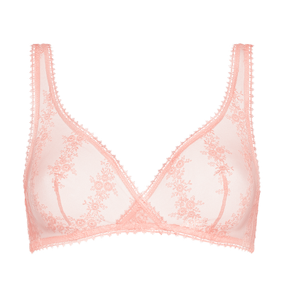 El sujetador Gourmande aúna feminidad y bienestar gracias a su tul bordado con motivos florales y a sus tirantes finos decorados con galones sofisticados.
