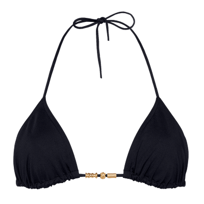 Este triángulo de cortinilla sobre cordón fino es un básico del verano. Sus tirantes finos multiposición se llevan rectos o bien anudados al cuello. Sus perlas ofrecen un toque sensual y sofisticado.