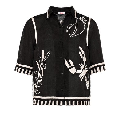 La camisa Crab de lino está decorada con bordados en la parte delantera y trasera, con un detalle de botones en el centro de la parte delantera y un cuello de camisa. Los bordados evocan un paisaje onírico con langostas, algas, conchas...